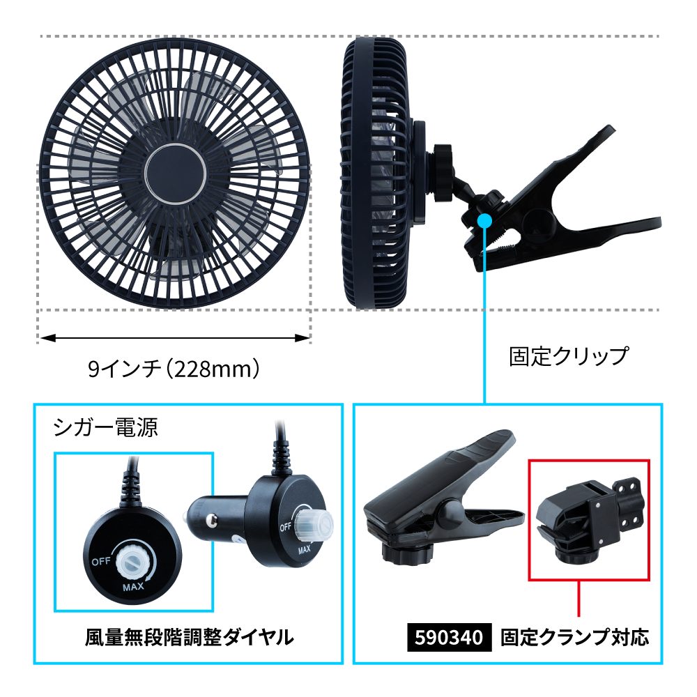 仕様 ブラシレスモーター、 左右首振り機能(手動)、 風量無段階調節スイッチ、 シガープラグ付電源コード(約3.0m)
