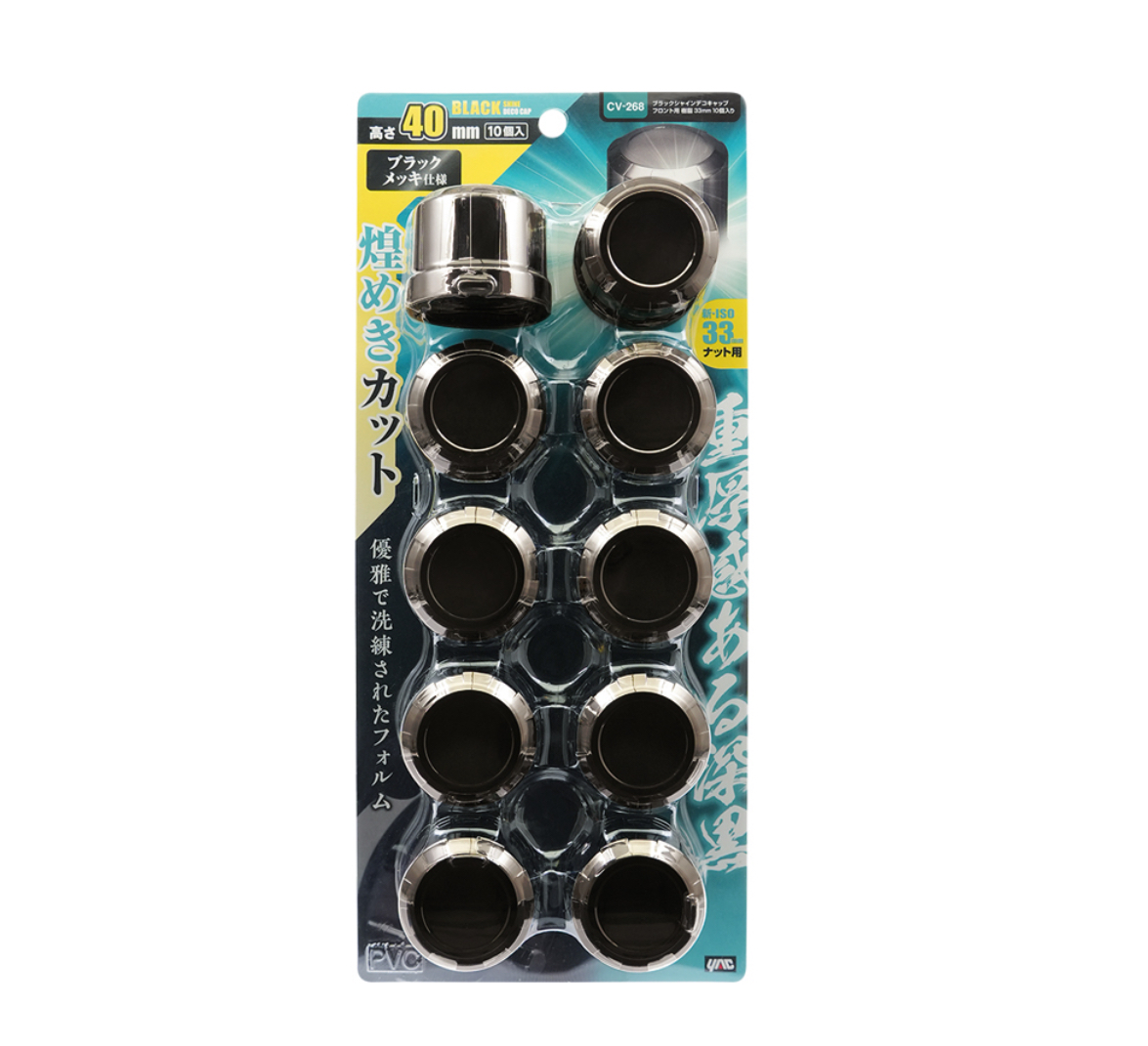 ●深黒な輝きを放ち、カラーホイールを際立たせるブラックメッキ仕上げのデコレーションキャップです。
