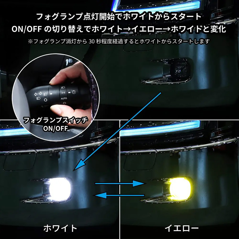 エンジン始動時などのランプONのときは必ずカラーはホワイトからスタート。 点灯状態からフォグランプスイッチのON/OFF切り替えで、ホワイト→イエロー→ホワイト~と切り替わります。 エンジン始動中ランプONからOFFにし、30秒経過後のONでホワイトからリセットスタートします。