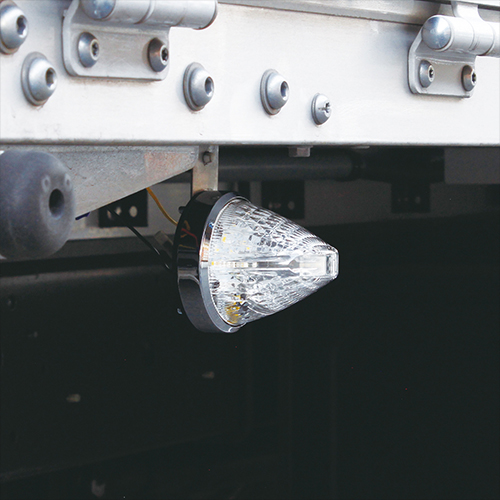 従来のマーカーランプの用途に加え、ライン光によって他車のサイドミラーに映りやすく視認性が向上。ダウンライトは地面を照らし、車幅確認をしやすくする。