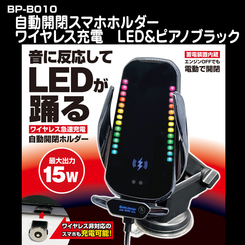 自動開閉スマホホルダー ワイヤレス充電 LED&ピアノブラック【BP-B010】