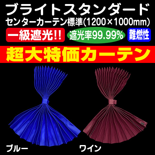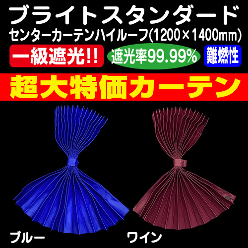 <特価カーテン>ブライトスタンダード センターカーテンハイルーフ(1200×1400mm) ブルー・ワインのみ (8,430円→2,980円にプライスダウン)ツヤ有 難燃性 一級遮光 【2枚1台分】