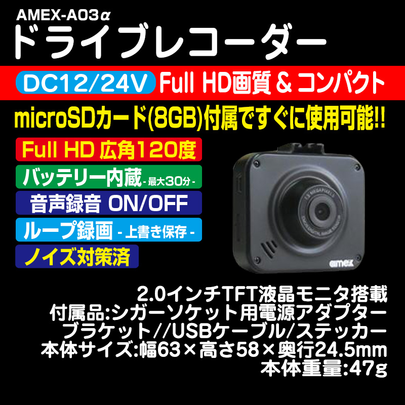 【12/24V共用】AMEX-A03α ドライブレコーダー (Full HD画質)