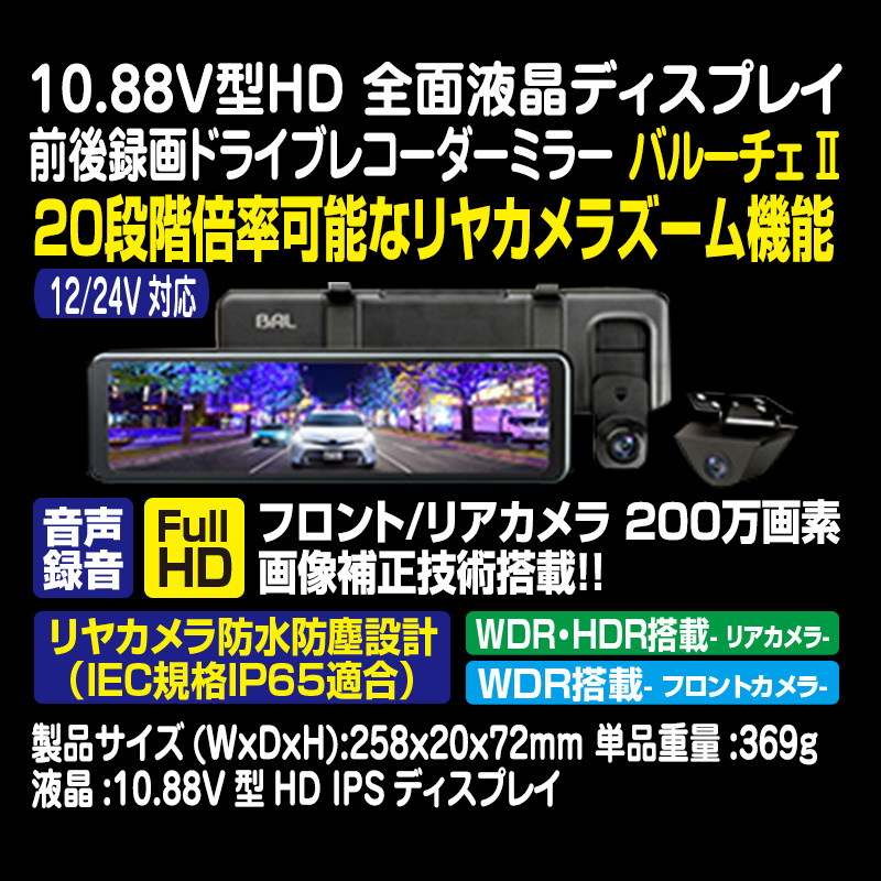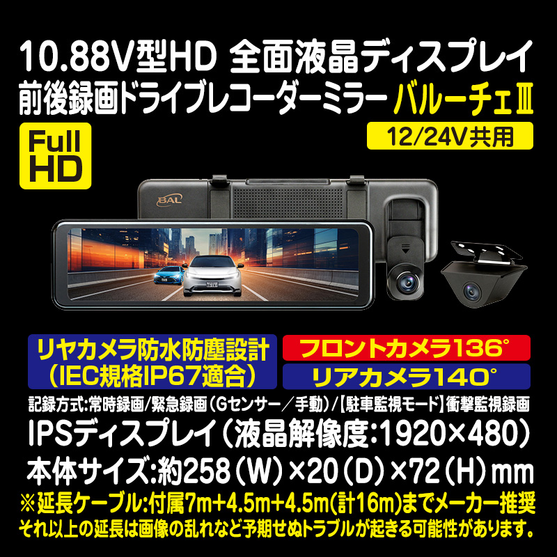 10.88V型HD 全面液晶ディスプレイ 前後録画ドライブレコーダーミラー バルーチェⅢ (BALUCE Ⅲ No.5710)[フロント&リアカメラ搭載]