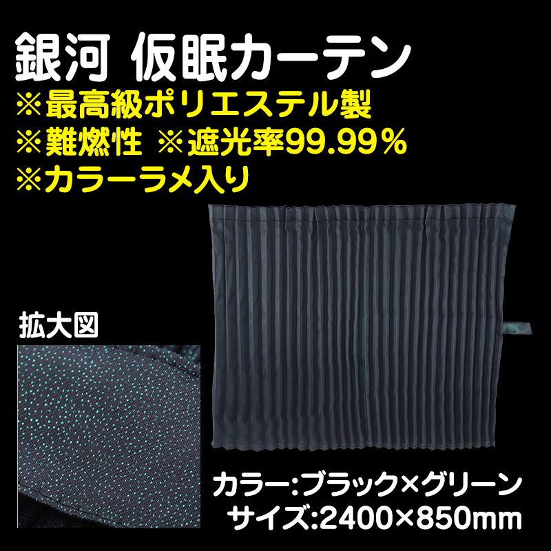 ラメ入り銀河アコーディオン式仮眠カーテン ブラック×グリーン 2400×850mm(一級遮光・難燃製) 【2枚1台分】