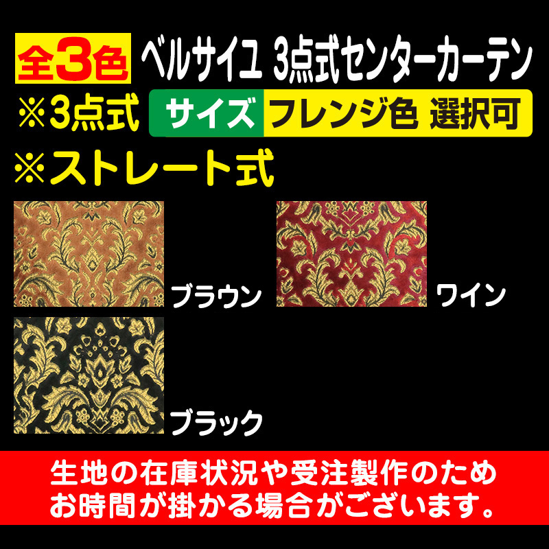 ベルサイユ 3点式センターカーテン[全4色] サイズ/フレンジ色 選択可能 (受注製作品/代引き不可)【2枚1台分】