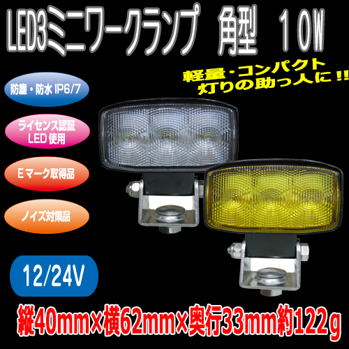 LED3ミニワークランプ・バックランプ 角型10W(12V/24V共通)イエロー