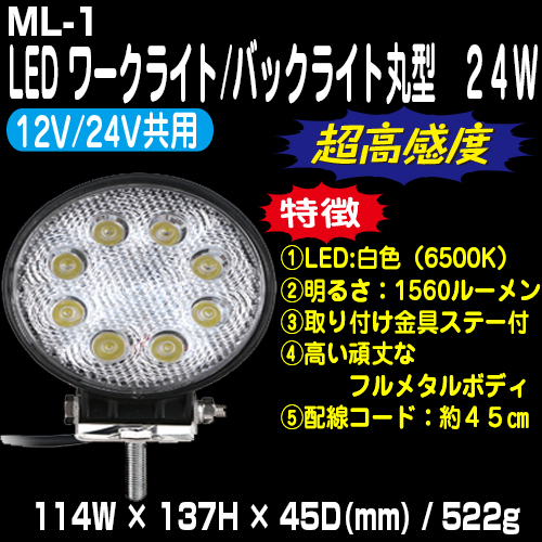 LEDワークライト・バックライト(作業灯) 24W 丸型(12V/24V共用)ML-1