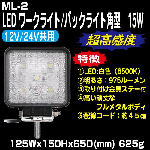 LEDワークライト・バックライト(作業灯) 15W 角型(12V/24V共用)ML-2